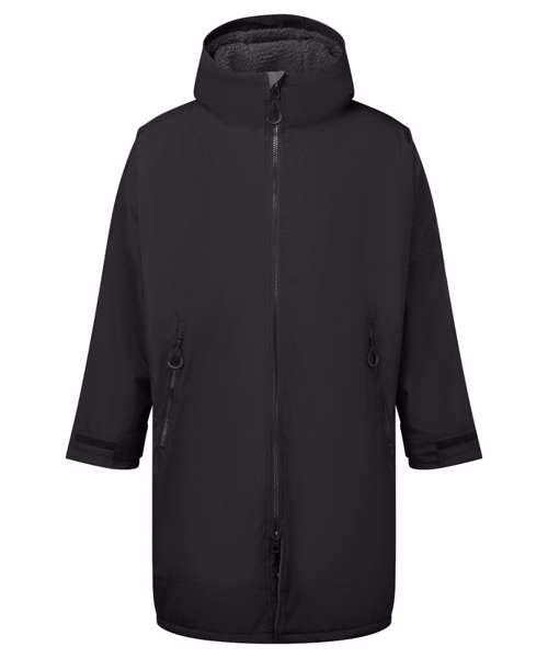 Unisex. Oversized. Full-length two-way plastic zip with easy pull toggles. Chin guard. Oversized fit. Side vents. Adjustable cuffs with hook and loop fastening. Side zip pockets. Inside pocket with zip on the left side. Inside patch pocket on the right side. 3-panelled hood. Loop on the centre back of the jacket for hanging the robe. Dropped back hemline. (5000/5000 waterproof and windproof). Embroidery access to the back and chest area can be accessed through here. Waterproof taped seamed outer layer. Sherpa fleece interior. Rebrandable stuff sack carry bag with double drawstring straps. CE Class 1 Certified.